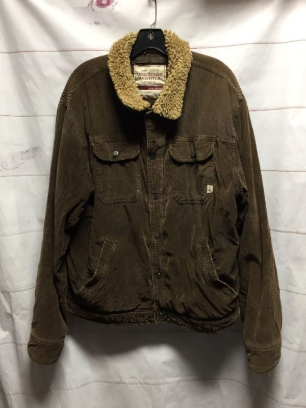ABERCROMBIE & FITCH JACKET, CORDUROY, ZIP-UP INTERIOR WITH OUTER SNAP-UP, SHERPA LINED, 4 FRONT POCKETS 2 WITH SNAP-UP FLAPS, BROWN/TAN, SIZE L