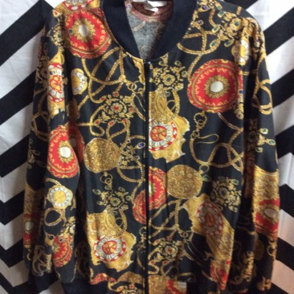 Bomber jacket, zip-up, cotton, Baroque watches & chains print, black/gold/red, size L
