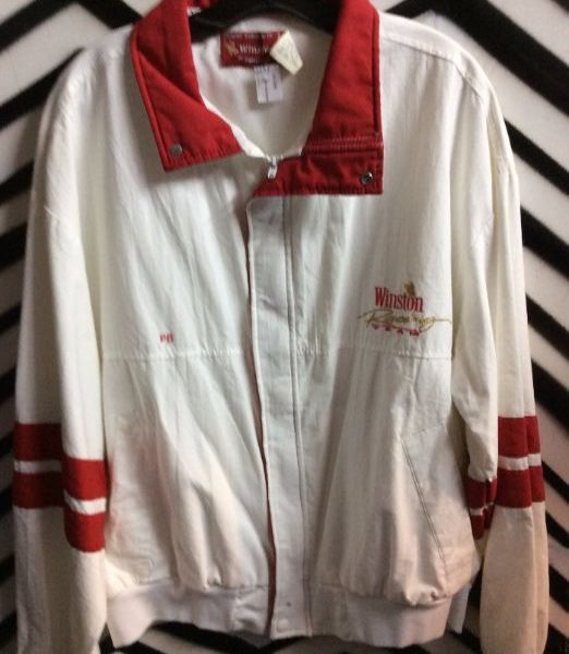 Winston Racing Team jacket, cotton, long sleeve button-up, embroidered lettering, white/red, size XL as is