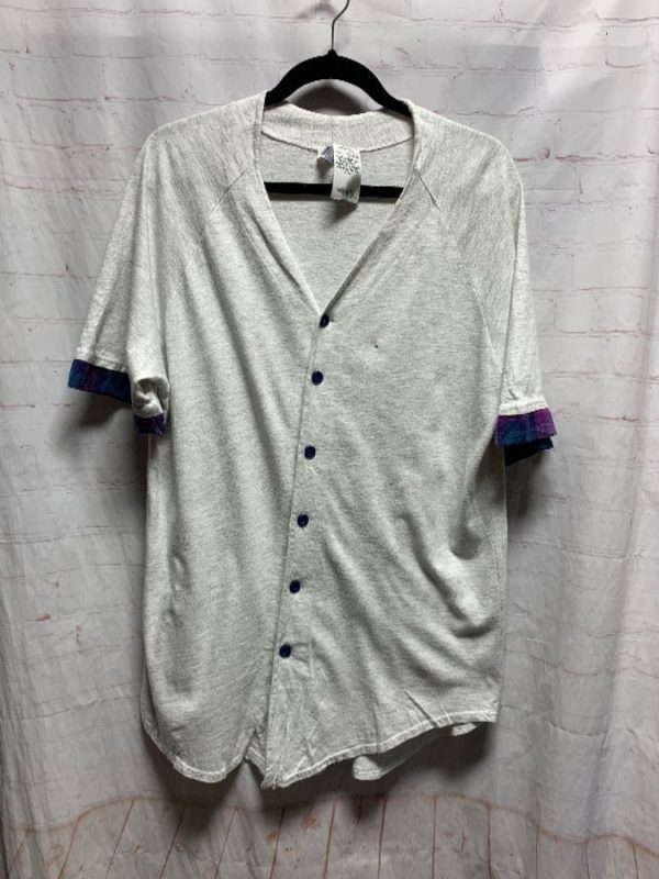 Gotkey baseball jersey, cotton, short sleeves, button-up, v-neck, plaid sleeve trim, gray/blue/purple, size XL As is