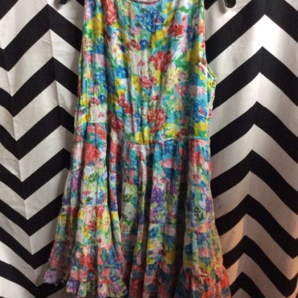 Dress, sleeveless mini, button-up front, cotton gauze fabric, watercolor floral print design, white/turq/pink/green/yellow