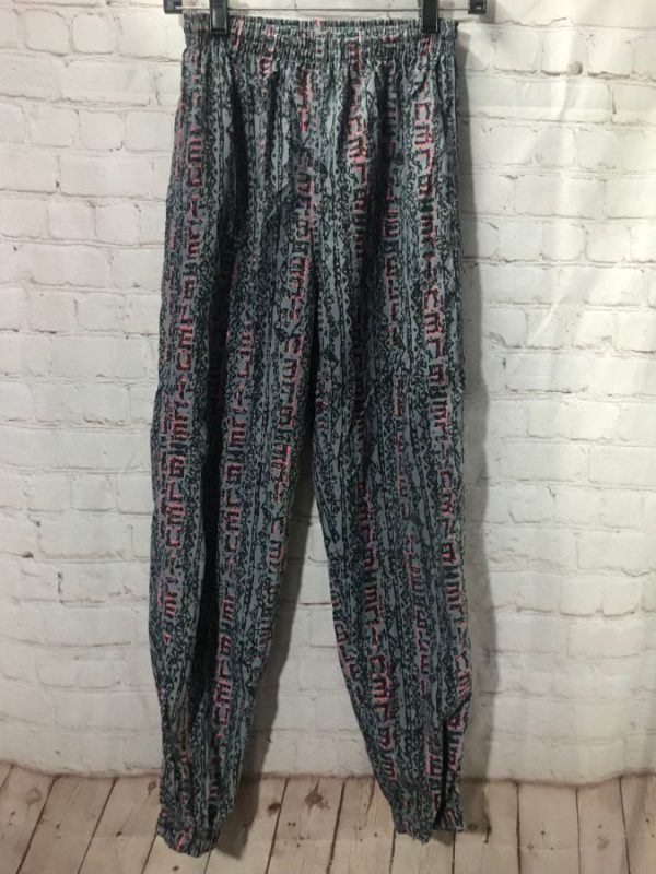 1980’s pants, nylon, MC Hammer style, elastic waist & drawstring, elastic ankles, Saved By The Bell look funky print, blue/black/pink, XS/S
