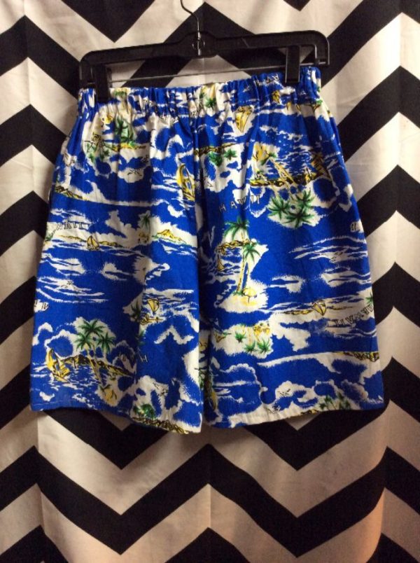 Cotton shorts with Hawaiian ocean/palm trees/islands print, blue/white/green, size L