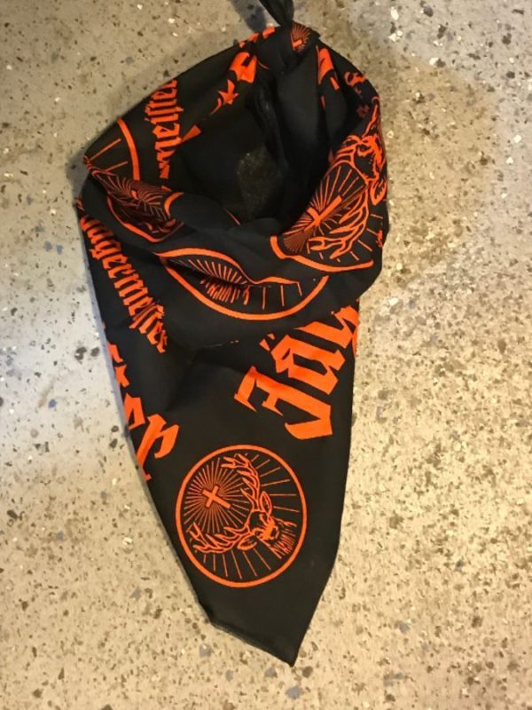 JAGERMEIST BANDANA, COTTON, SQUARE SHAPE, PRINT WITH LETTERING & 4 CIRCULAR DESIGNS WITH DEER & CROSS IN CENTER AND 4 IN CORNERS, BLACK/ORANGE