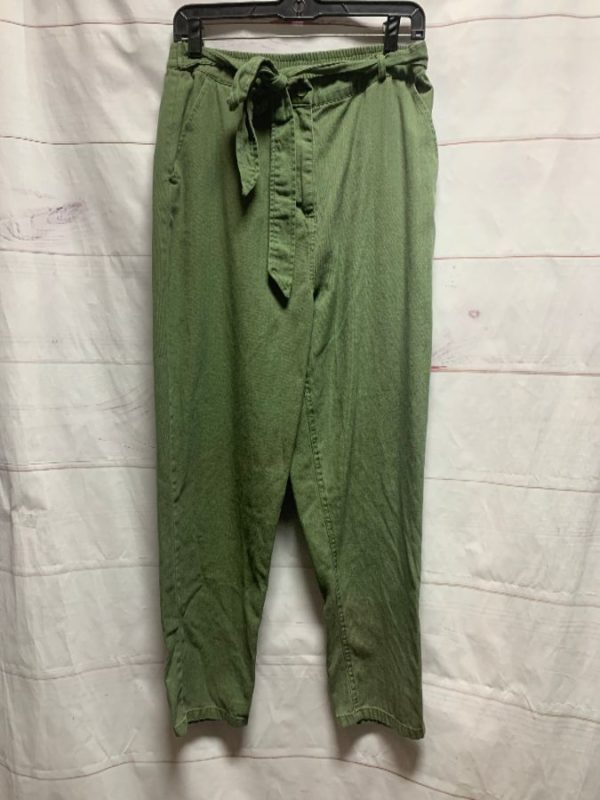 SOSIO PANTS, COTTON, ELASTIC WAIST, ATTACHED KNOTTED TIE BELT, 2 SIDE & 1 BACK POCKETS, OLIVE GREEN, SIZE M
