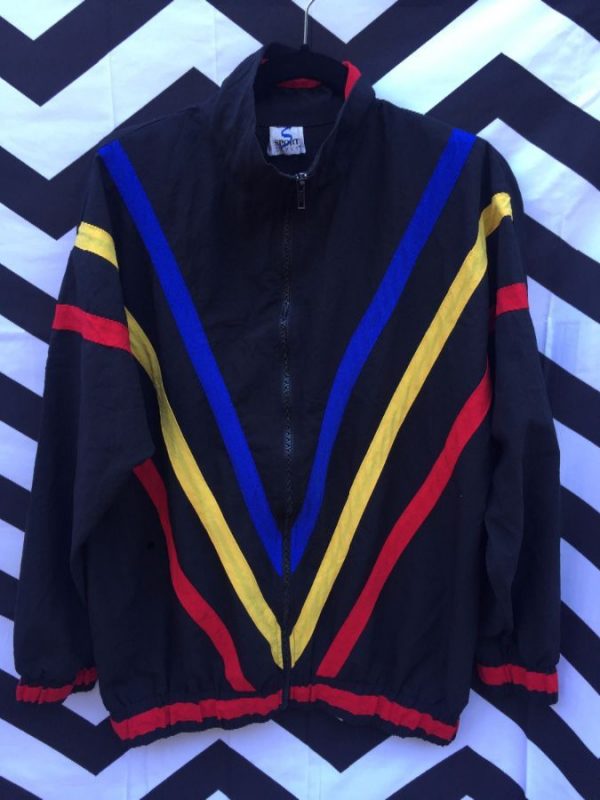 Windbreaker jacket, cotton, zip-up, primary colors, color block design, v shaped front pattern black/blue/yellow/red, size L