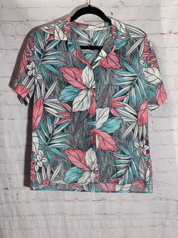 Shirt, cotton, cropped, short sleeves, button-up, tropical print, black/white/teal/pink, size S small fit