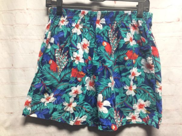 Shorts, cotton, elastic waist, flowy, colorful tropical floral print with parrots & hibiscus, side pockets, blue/green/white/orange/black, size S As is