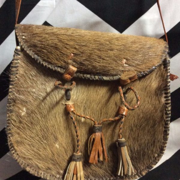 Bag, leather, cow hide with hair on, thin straps, braided strap with 3 fringe ties, brown/gray/creme