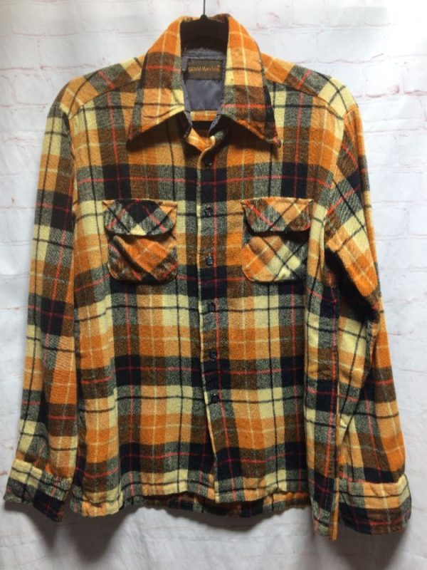 David Harrison flannel shirt, trucker style, long sleeves, button-up, cozy, fun retro color-way, orange/black/red/creme, size S