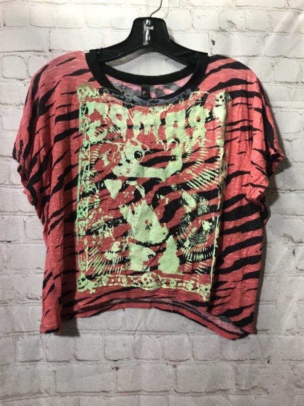Fulltilt shirt, pullover, short sleeves, tiger stripe fabric, Cramps, Bad Music For Bad People, screen printed graphic designs full front & back, red/black/green/purple, size L