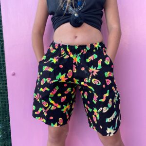 AMAZING DEADSTOCK 1980S DAYGLO NEON BEACH PRINT SHORTS WITH STRETCH WAIST
