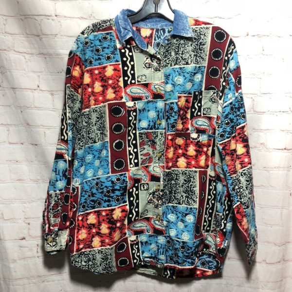 Shirt, long sleeves, button-up, acid washed collar, crazy colorful abstract print, tribal pattern in a patchwork design, front pocket, blue/red/green/orange/black