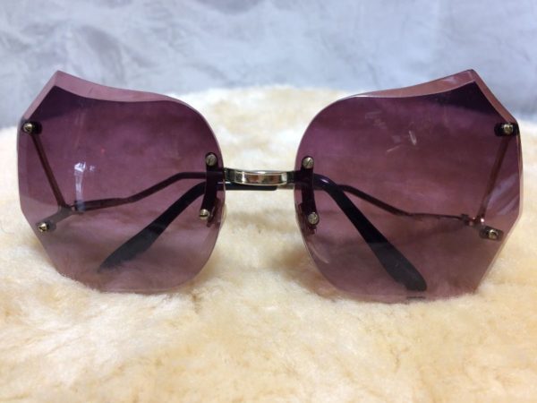 1970’s sunglasses, butterfly shaped, beveled outer edges, thin metal frames, frames are h shaped and bottom connected temple pieces, dead-stock, purple/gold