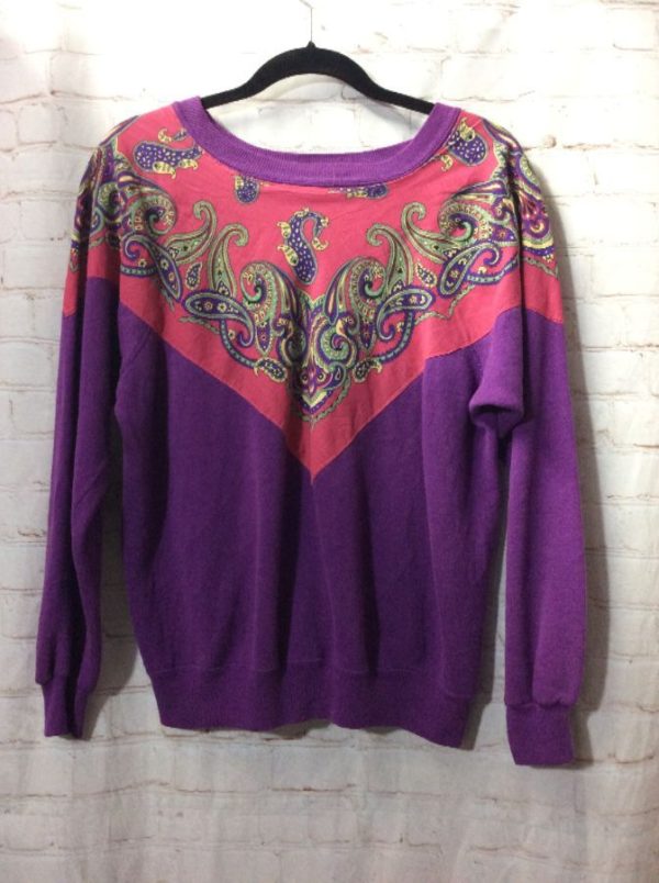CREW-NECK SWEATSHIRT W/ PAISLEY PRINT V-SHAPED NECK APPLIQUE
