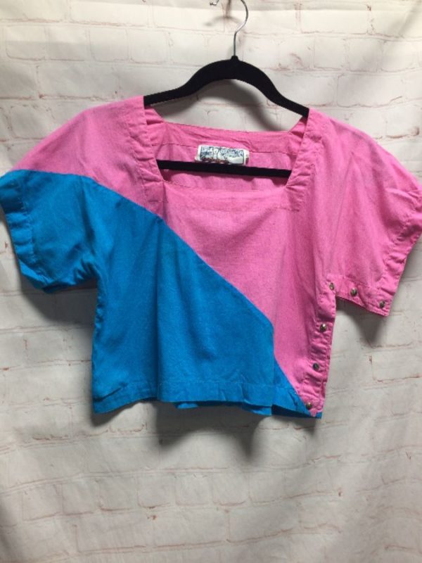 Contempo Casuals top, cropped top, short sleeves, button-up on side, square neck, diagonal color-block design, pink/blue, size S
