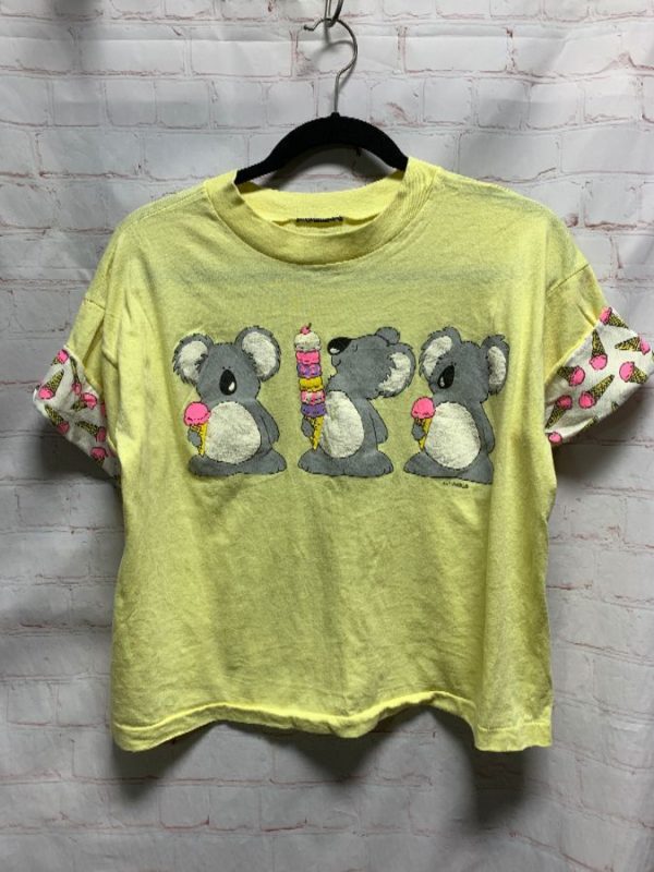 Oasis shirt, crop top, short sleeves, rolled up cuffs with ice cream print, screen printed Koala Bear design, yellow/gray/pink/white As is