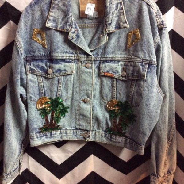 JORDACHE DENIM JACKET – CROPPED – SEQUIN APPLIQUE PATCHES – ACID WASHED