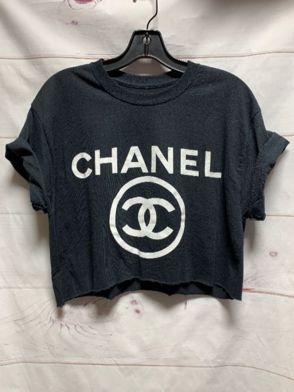 FAUX-REALZ T-SHIRT, CROPPED, CHANEL, CC LOGO, SCREEN PRINTED FULL FRONT DESIGN, BLACK/WHITE, SIZE M