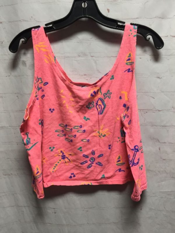 Eye Catcher tank top, cropped, cotton, neon colors, beachy print with fishes/anchors/sea shells/palm trees, dead-stock, neon pink/yellow/teal/purple, size L