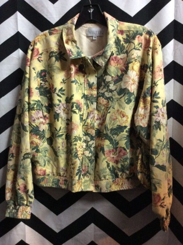 Windbreaker jacket, zip-up, cropped, brushed cotton, floral print design, yellow/green/pink, size M