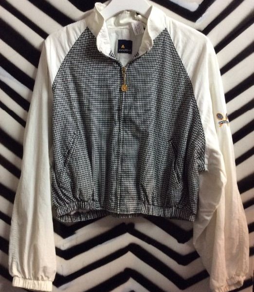 Houndstooth windbreaker, cropped, zip-up, embroidered tennis rackets on sleeve, white/grey