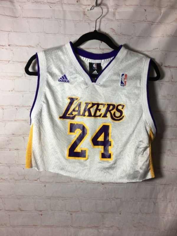 Adidas basketball jersey, cropped, v-neck, Los Angeles Lakers, #24 Kobe, mesh fabric, screen printed lettering/number full front & full back, stripes down sides, embroidered Adidas & NBA logos, white/purple/yellow, size M