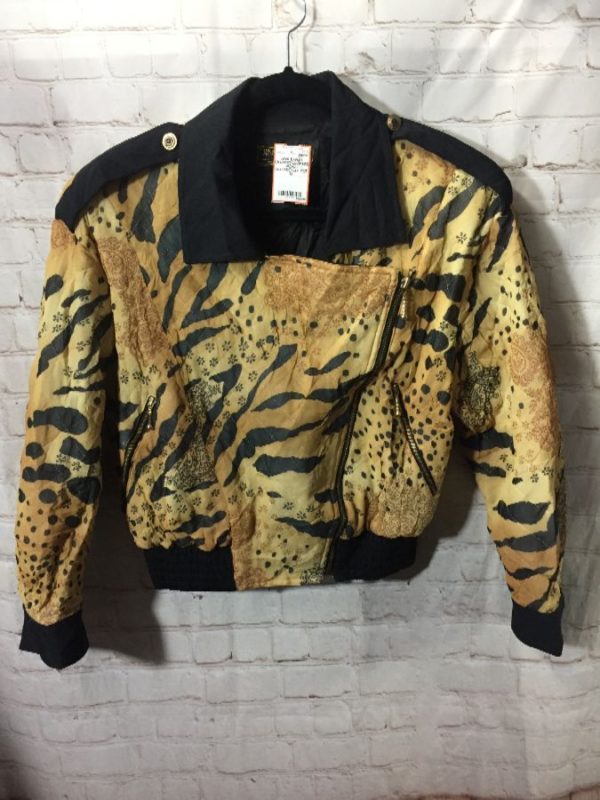 Dina Bar-El jacket, cropped, motorcycle style with crossover closure, zip-up, zippered pockets, epaulets on shoulders, Leopard print design, contrasting solid colored trim on collar/cuffs/hem/epaulets , tan/black, size M