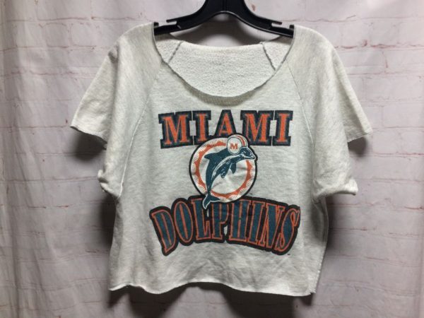 Garan sweatshirt top, pullover, cropped, sleeves/neck/hem cut & overcast, off-shoulder, Miami Dolphins, screen printed full front graphic, gray/orange/teal/black/white, size XL