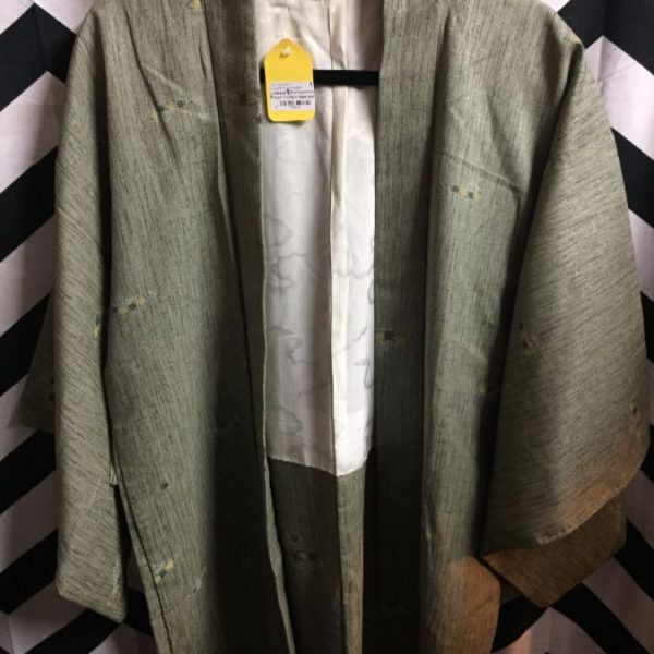 KIMONO, CROPPED, SILK, FAN & CLOUD DESIGN LINING, SAGE GREEN, SIZE L