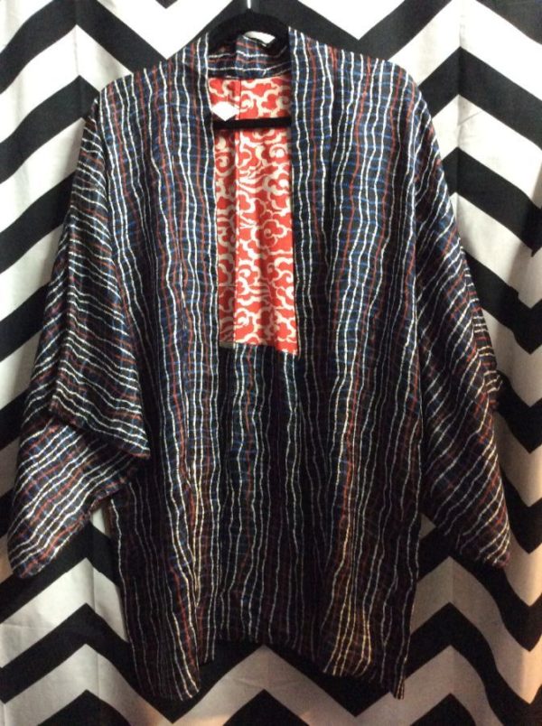 Kimono, cropped, silk, vertical squiggly lines & grid pattern, blue/coral/white, size one size