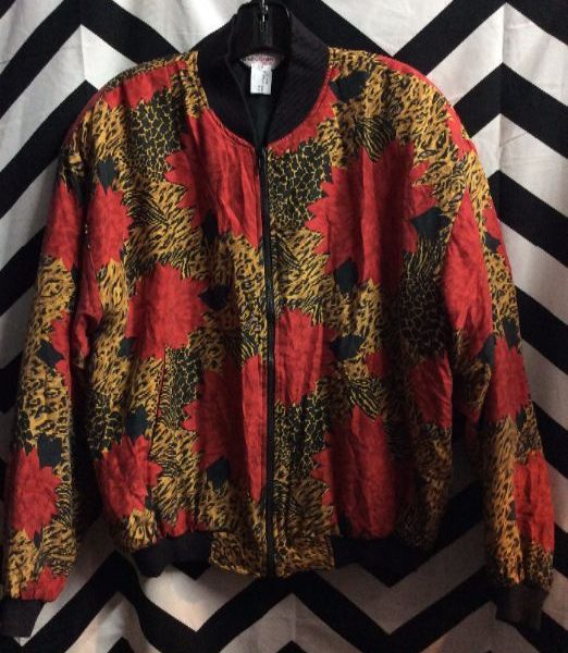 Bomber jacket, cropped, silk, leopard & floral print design, tan/red/black, size M