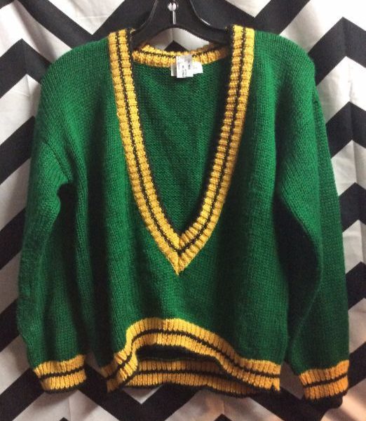 Sweater, cropped, wool knit, soft, varsity style, deep v-neck, green/yellow