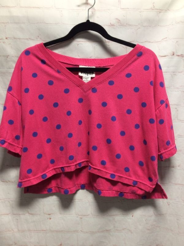 Croquet Club shirt, pullover, short sleeves, cropped top, v-neck, polka dot print, pink/blue, size S