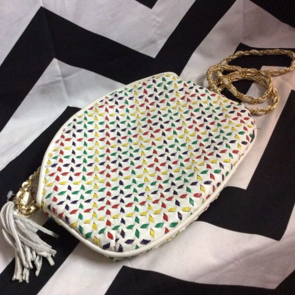 Purse, leather, cross body chain strap, multi-color interwoven leather design, tassel, white/green/yellow/purple/red