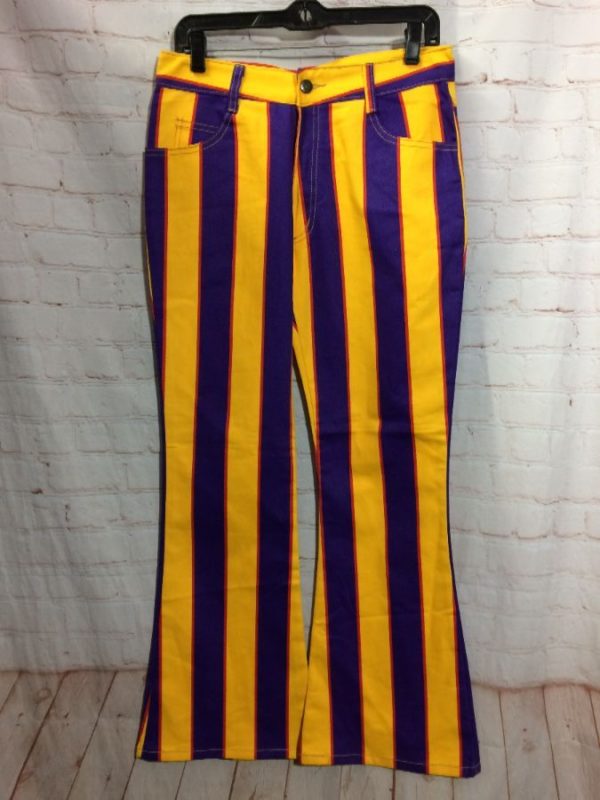 1990’s Hard Core jeans, cotton, zip-up, flared legs, vertical striped print, CrossColors color-block design, dead-stock,yellow/purple/red, size 28/M