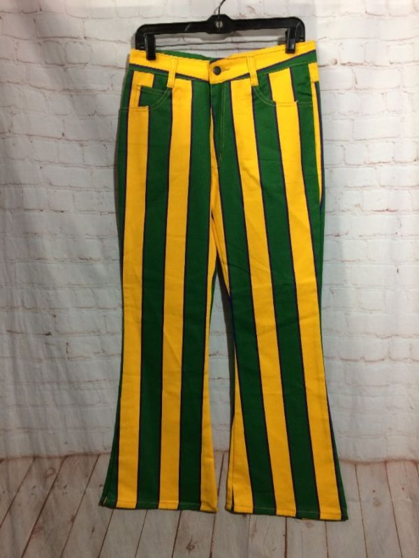1990’s Hard Core jeans, cotton, zip-up, flared legs, vertical striped print, Cross Colors color-block design, dead-stock, yellow/green/blue, size 28/M