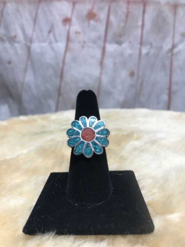 Ring, crushed turquoise & coral stones, flower design with coral center & turquoise petals, sterling silver 925 mounting, turquoise/coral/silver, size 7
