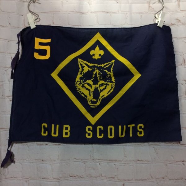 Bandana, square shape, Cub Scouts, #5, Wolf logo in diamond with fleur de lei over head, strings on right side corners, navy blue/yellow