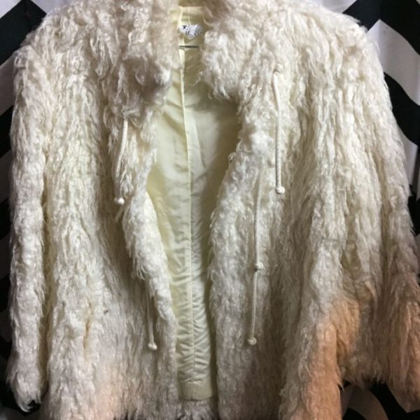 Vintage jacket, custom made, faux long shaggy hair, mid length, long ties, creme, size 12/L