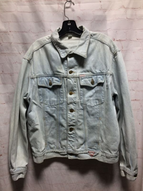 1980’s George Marciano for Guess denim customized jacket, button-up, front pockets with buttons, small logo on front left bottom, 3 square patches in vertical pattern with slight size reduction from top to bottom, light acid washed, pale blue, size XL As is