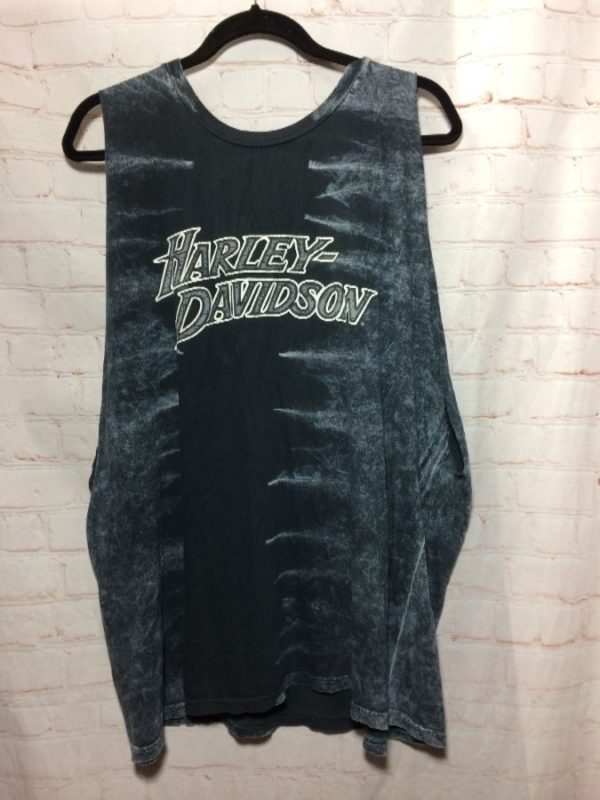 Harley Davidson tank top, cut-off sleeves, mineral wash tie-dyed effect, Fink’s, Zanesville-Ohio, screen printed front & back designs, faded, black/gray, size L