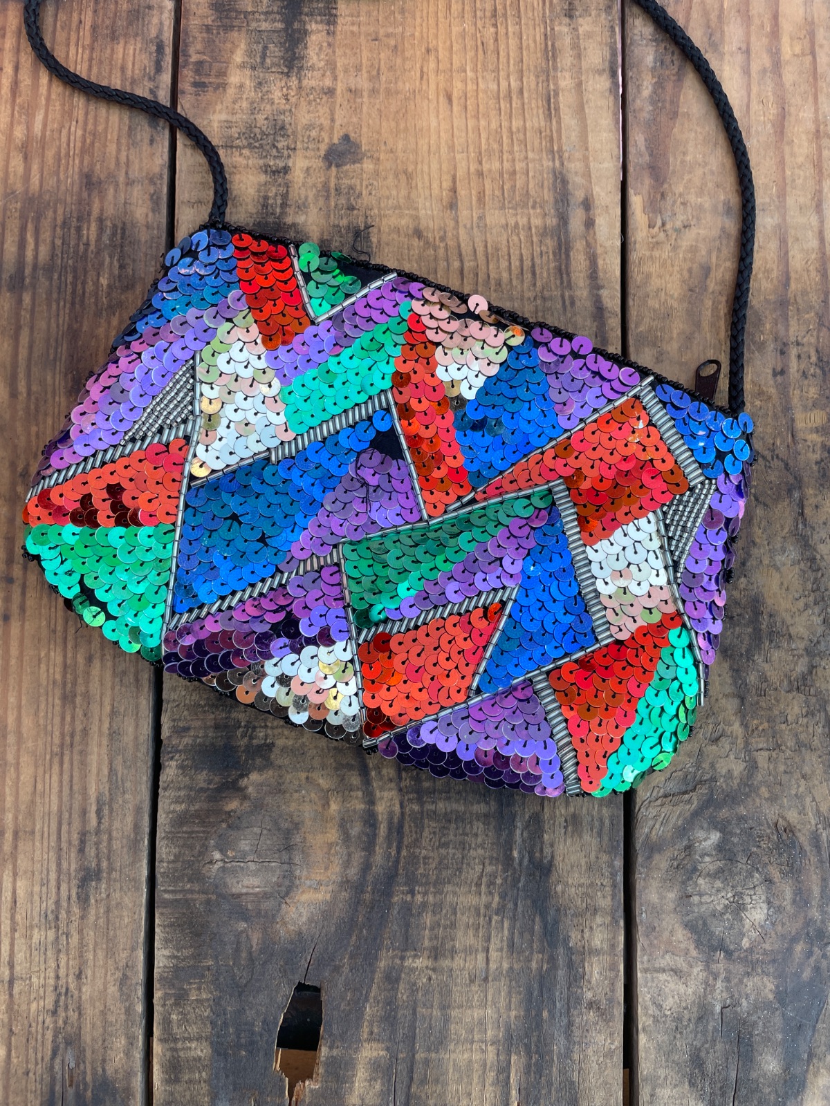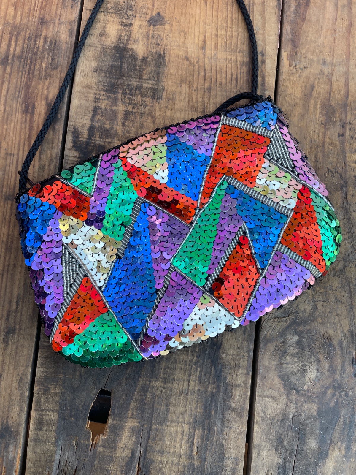 CUTE! 1980S-90S COLORFUL SEQUIN PURSE GEOMETRIC DESIGN, ROPE STRAP- MADE IN MACAU