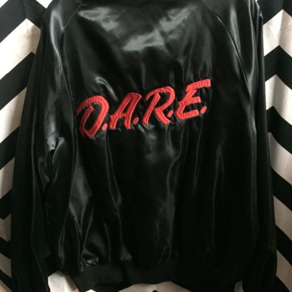 Sports jacket, satin, button-up, D.A.R.E. embroidered lettering on back, black/red, size L
