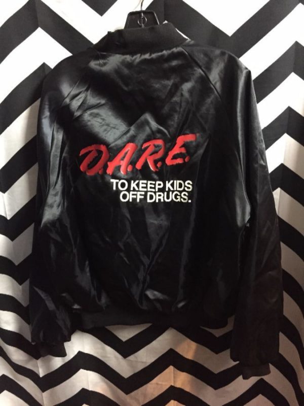 DARE satin jacket, zip-up, D.A.R.E. To Keep Kids Off Drugs screen printed across back, black/red/white, size L
