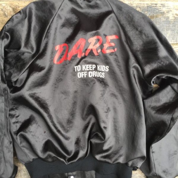 Sports jacket, satin, button-up, screen printed lettering D.A.R.E. To Keep Off Drugs & Violence back design, black/red/white, size L