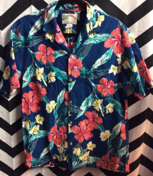 Hawaiian shirt, short sleeve, button-up, tropical floral print, dark blue/red/teal, size L