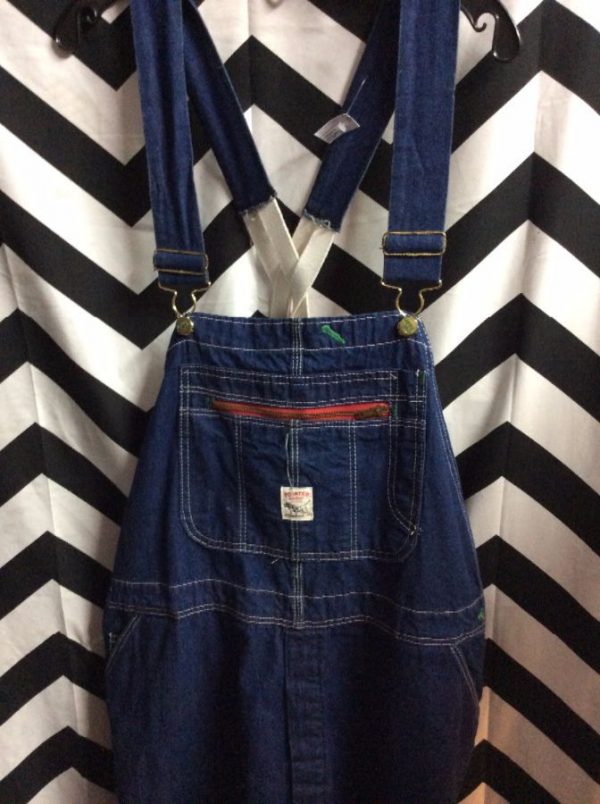 CLASSIC DARK DENIM OVERALLS GREEN TRIM ZIP FRONT POCKET