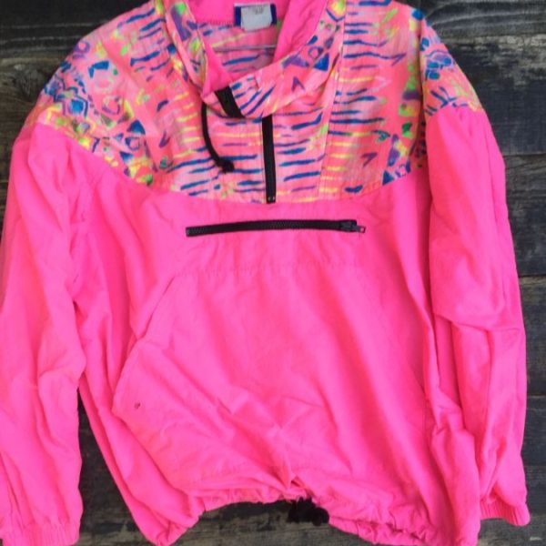 Windbreaker jacket, 1/4 zip-up, day-glow colors, funky pattern, color-block design, day-glow, size M
