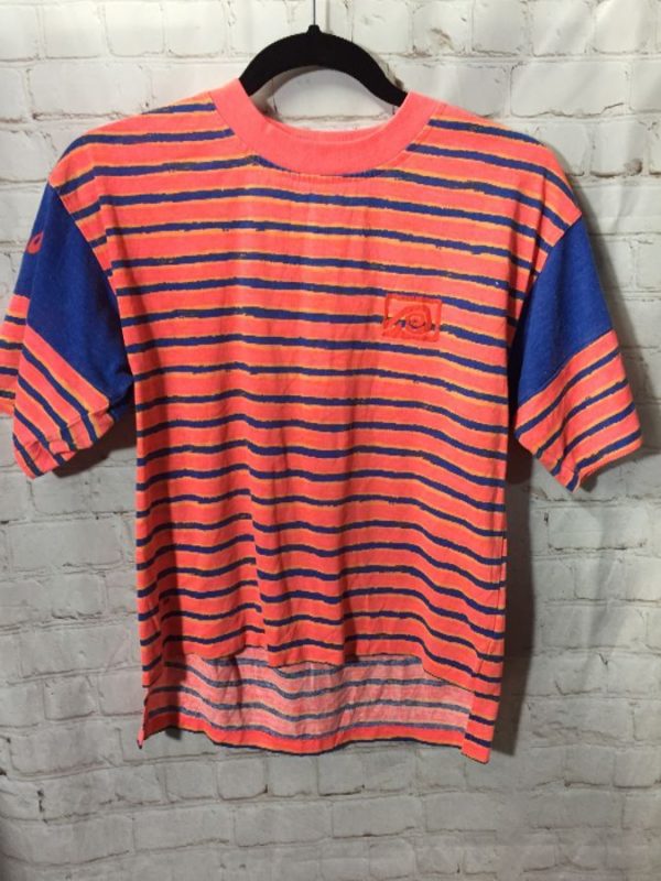Surfs Edge T-shirt, ringer Tee, thick stripes on top of sleeves with logo, horizontal striped design on body & lower sleeves, day-glow neon colors, screen printed logo with puffy/cracked, neon orange/blue, size M small fit